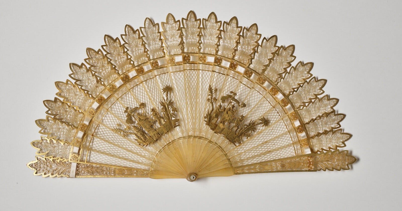 Acquis en 2020, cet éventail en corne de type brisé est très intéressant pour son travail d’ajourage en motif de treillage. D’une grande finesse d’exécution, il représente une scène laissant contempler deux groupes dans le goût chinois, composés d’un dignitaire promené en palanquin et de ses sujets. Si les modèles de chinoiseries sont caractéristiques de l’art décoratif du XVIIIe siècle, l’éventail brisé connaît quant à lui un nouvel essor dans la première moitié XIXe, après une éclipse au siècle précédent.