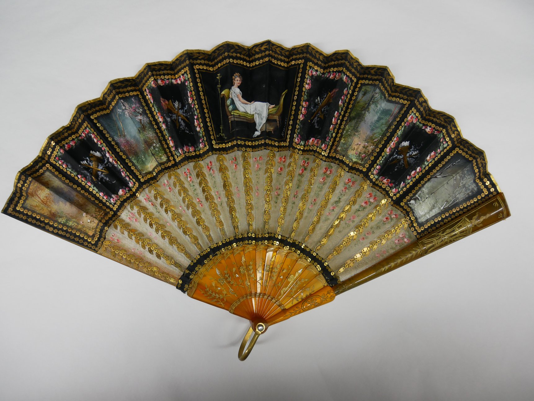 L’éventail tire son titre du sujet représenté dans le cartel central. Il s’agit d’une copie du portrait de Madame Récamier (1777-1849) peint vers 1800 et conservé au Louvre. Fille de notaire, épouse d’un riche banquier proche de Napoléon Ier, la jeune femme est un symbole de réussite sociale pour son époque. Sa compagnie est alors très prisée de l’élite française et européenne.