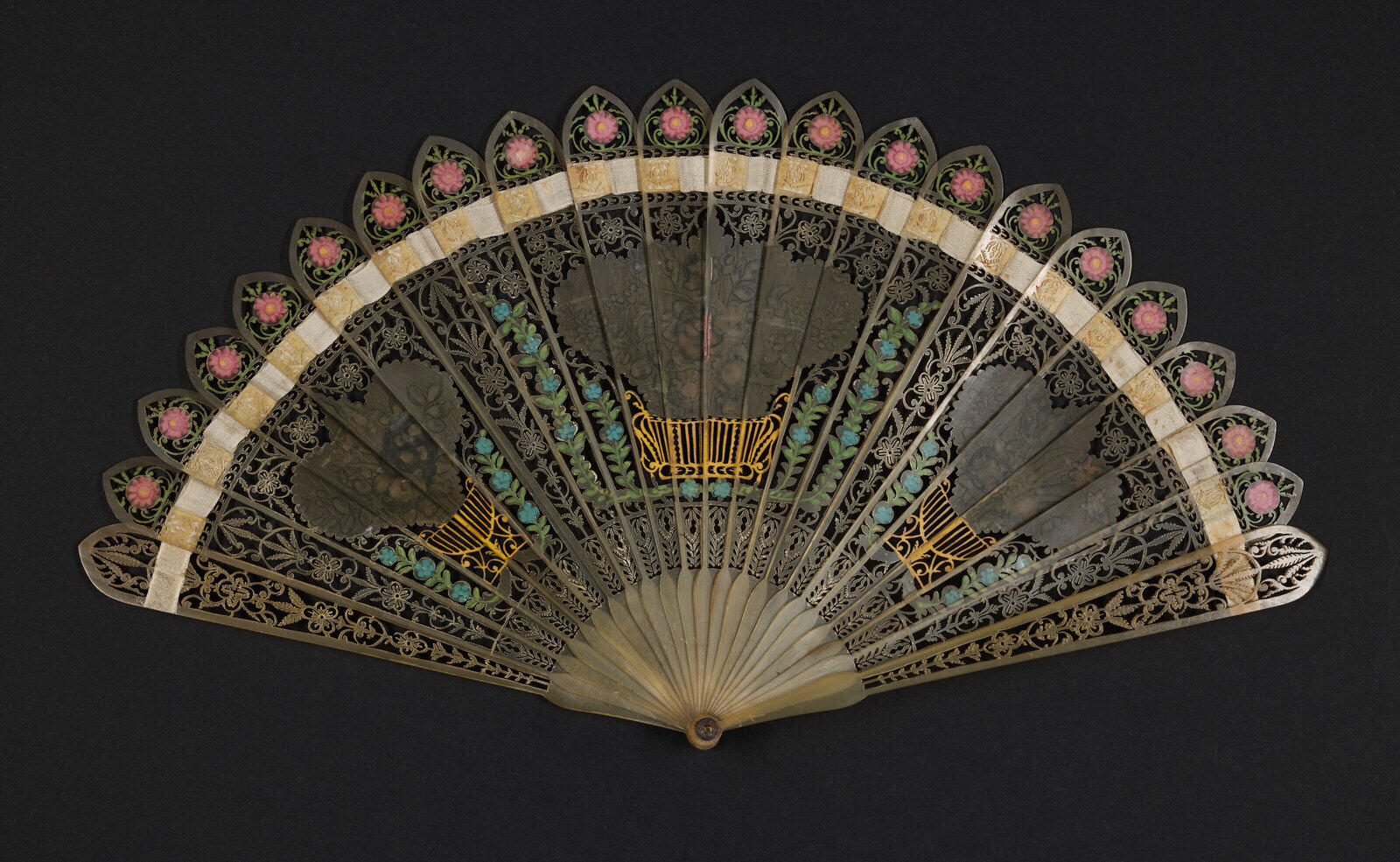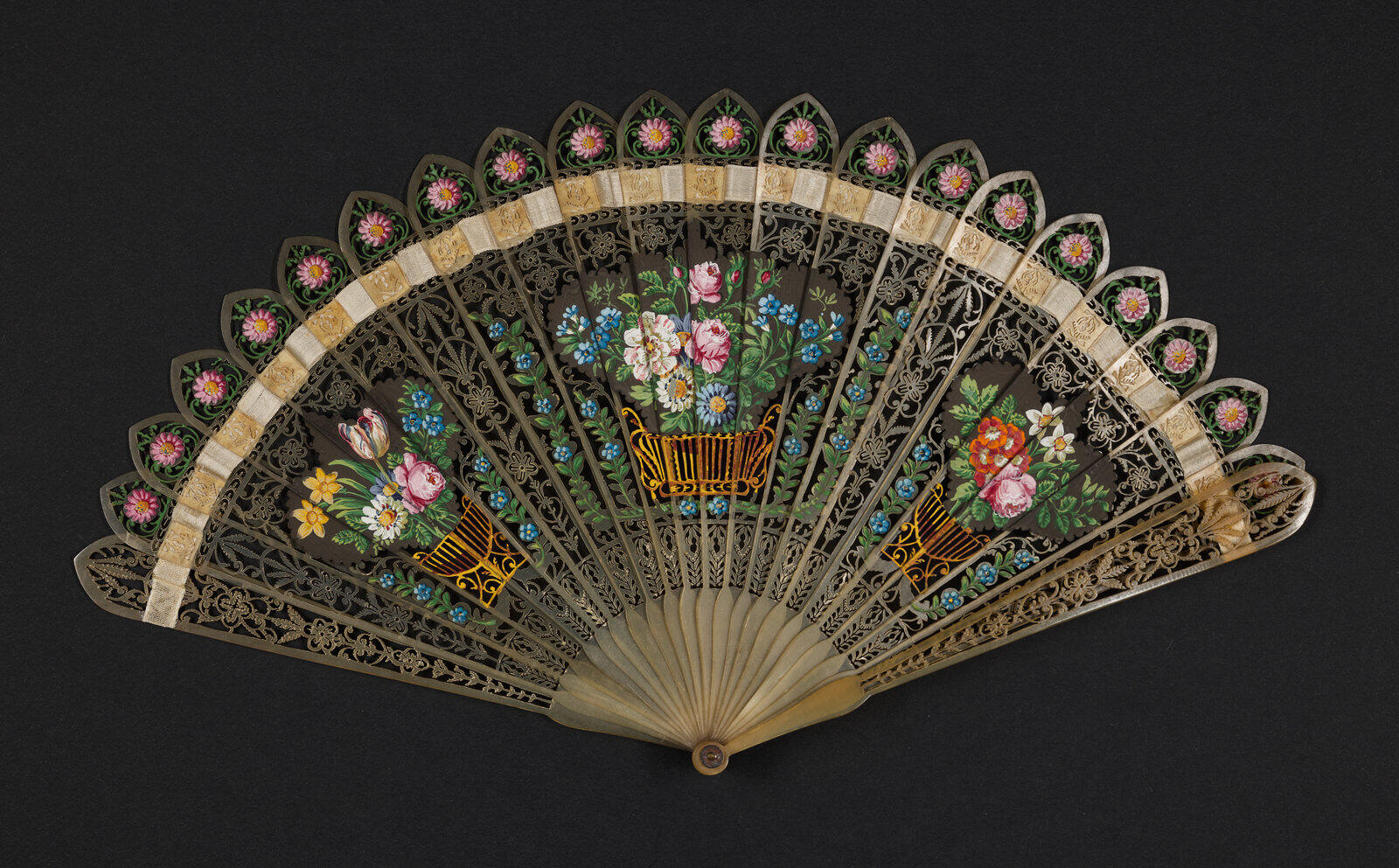 Il s’agit ici d’un éventail brisé dont chaque brin est entièrement taillé dans le même matériau : la corne blonde. Deux types de décors s’assemblent harmonieusement sur cet ouvrage : les motifs floraux découpés dans la matière grâce à une scie à chantourner répondent ainsi aux fleurs peintes à la main. L’ensemble nous expose trois paniers garnis de fleurs aux couleurs vives. De petite taille, cet accessoire devait appartenir à une jeune fille au début du XIXème siècle.
